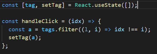삭제버튼을 누른 tag를 filter함수를 이용해서 걸러준다. -> 삭제된 tag를 제외한 나머지 값들을 useState를 이용해서