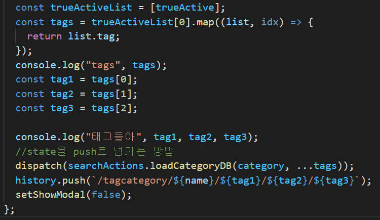 2. 디스패치 후에 history.push로 컴포넌트에 state를 다시 넘겨줘서 삭제된 tag배열을 받아서 map돌려서 화면에 다시 뿌려주도록 해야한다.